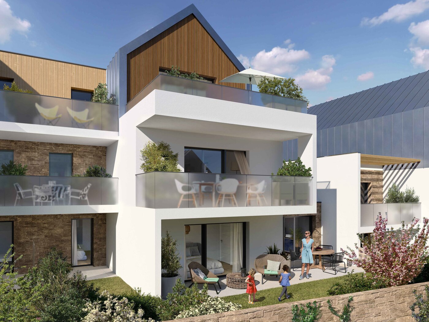 Cette résidence intimiste conjugue tradition bretonne et modernité élégante. Elle propose des appartements du 2 au 5 pièces ainsi que 3 villas familiales, toutes dotées de superbes espaces extérieurs : balcons, terrasses ou jardins privatifs paysagés. L’architecture met en valeur des matériaux nobles – granit, bois naturel, ardoise – qui subliment l’identité locale et renforcent le charme balnéaire ✨.